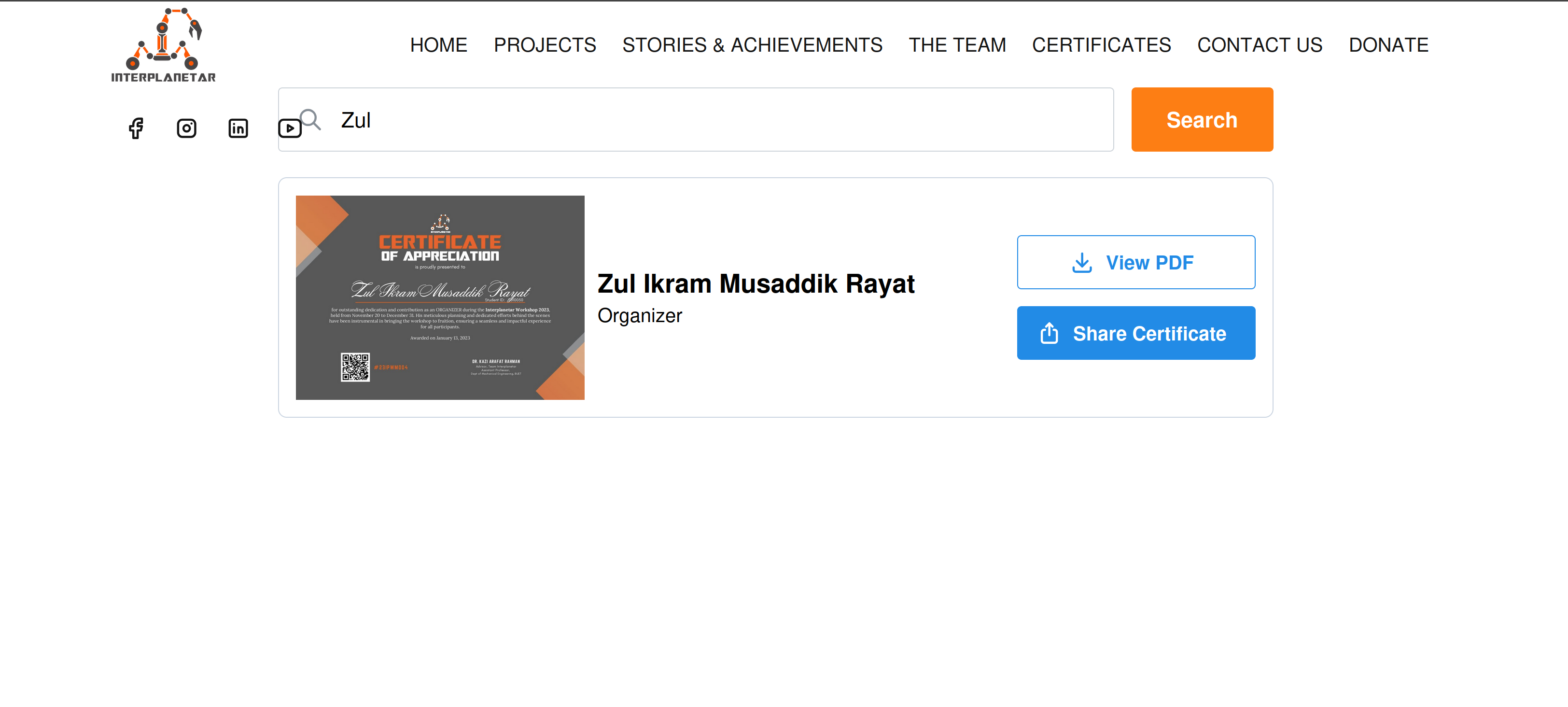 Team Interplanetar has started taking workshops on robotics and rover designing for a year or two. They provide digital certifications after the workshop completion. When I was the website manager at Interplanetar, I developed this extension website to store the online records of those certificates so that the attendees can verify their certificates anytime they want.